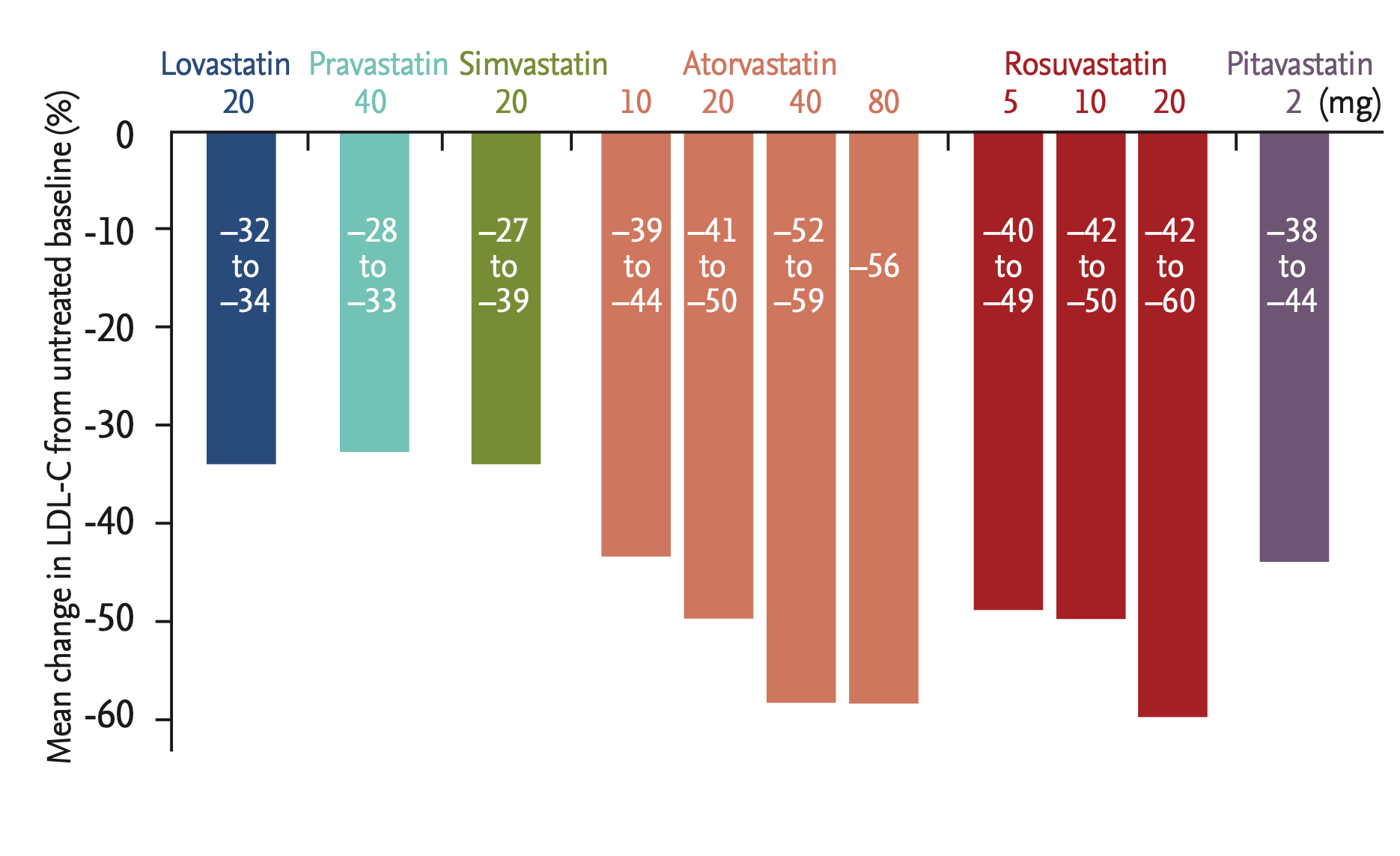 A range of statin therapies are available, usually lowering LDL cholesterol by 20 to 50%. With the average LDL cholesterol in the US at approximately 3.2mmol/l, this level of reduction is most likely to be sufficient for most individuals. Lifelong LDL cholesterol levels of less than 1.4 mmol/l are associated with extremely low cardiovascular event rates13. Statins reduce cholesterol by reducing cholesterol synthesis in the liver and increasing the concentration of LDL receptors in the liver to promote clearance14.